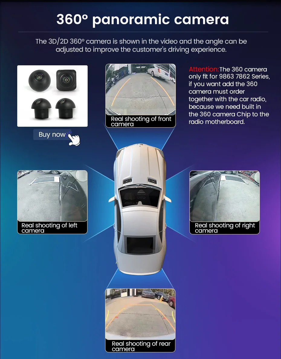> Поддержка панорамной камеры 360(TS3 TS4 TS5 TS6 TS7 TS9863)--- Панорамная камера 360 ° является функцией безопасности автомобиля. Окружающие камеры одновременно собирают изображения вокруг транспортного средства и передают их на блок обработки изображений. После серии обработки изображений, панорамный вид над транспортным средством, наконец, формируется и отображается на экране, интуитивно представляя местоположение и окружающие условия транспортного средства.