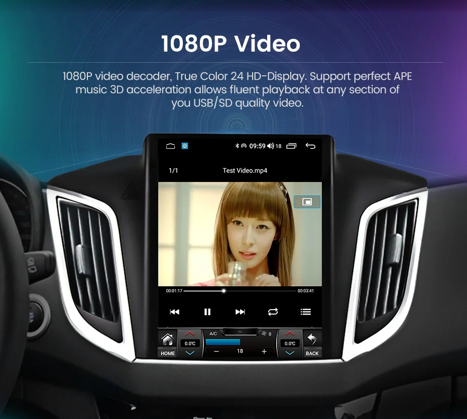 > 1080P видео:Настоящий цветной 24 hd-дисплей, поддержка идеального 3D ускорения музыки APE позволяет свободно проигрывать любой раздел видео USB/SD качества.