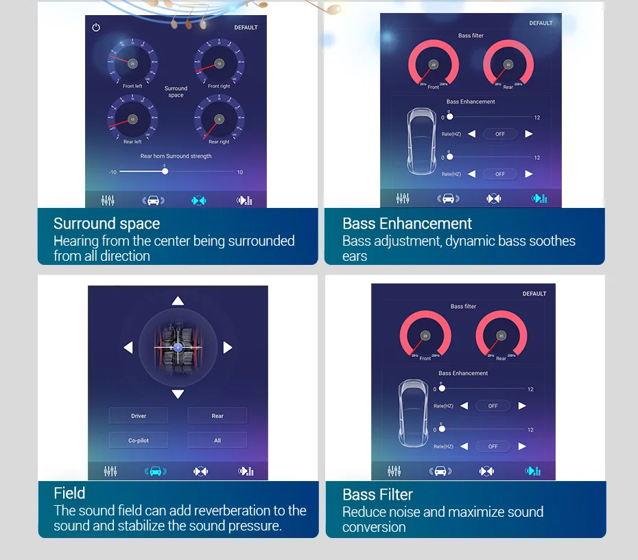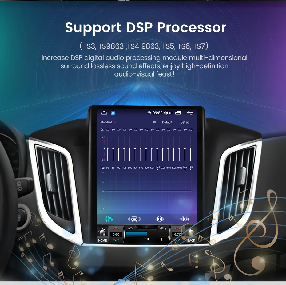 > Поддержка процессора DSP (только TS3 TS4 TS5 TS6 TS7 TS9863 с функцией DSP)Увеличьте DSP цифровой модуль обработки звука многомерные объемные звуковые эффекты без потерь. Делает высокие и гладкие, средний уровень богаче и бас полнее. Поддержка эквалайзера и регулировки положения. Лучший звук приносит лучшее путешествие. Наслаждайтесь аудиовизуальным праздником высокой четкости!