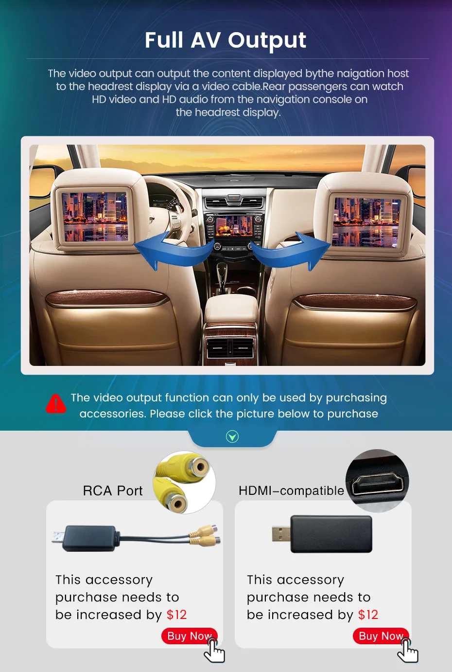 > Поддерживает полный выход AV:Видео на подголовник экрана, также поддерживает HDMI-совместимый, но AV порт и HDMI адаптер должны купить его отдельно.
