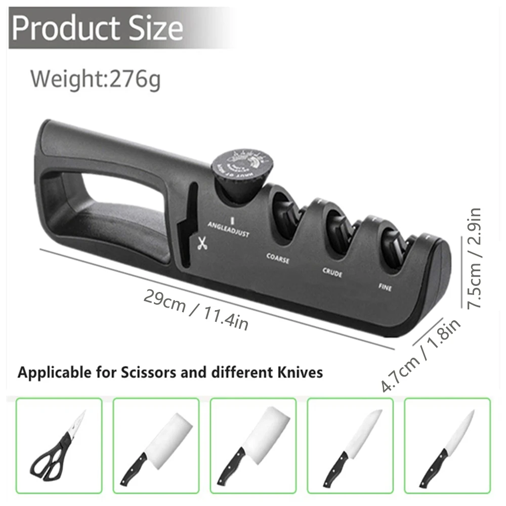 Как использоватьЭто 4 стадии точилка для ножей?Шаг 1-Вольфрамовая сталь для грубой заточкиШаг 2-Эмери для средней заточкиШаг 3-керамика для тонкой заточки