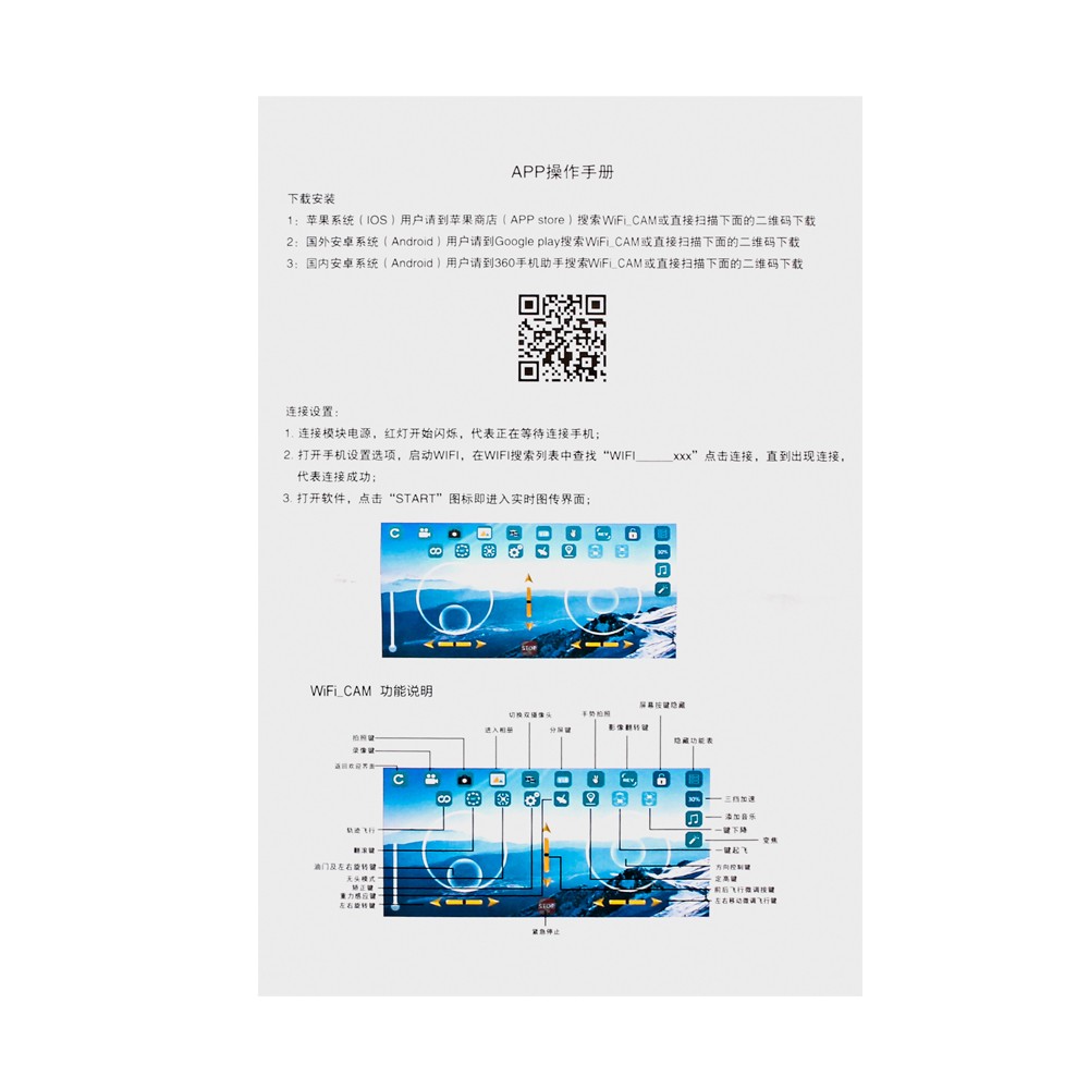 - Функции: вверх/вниз, вперед/назад, влево/вправо, боковой F светильник, светодиодный светильник, Безголовый режим, автоматическая кнопка возврата, режим удержания высоты, Поворот на 360 °, wiFi FPV