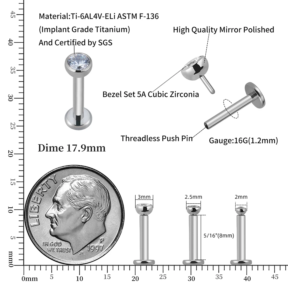 Отзывы о Правый большой ASTM F136 титановый 16G Безрезьбовой фианит шарик для губы верхняя