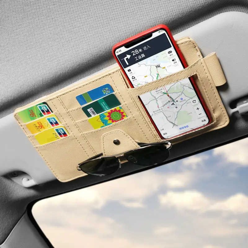 Попрощайтесь с беспорядок в машине, солнцезащитный козырек для хранения делает автомобиль аккуратным и упорядоченнымАвтомобильный солнцезащитный зажим для хранения: Высококачественная кожа, хорошо сделанная, может хранить компакт-диски, ручки, очки, сертификаты и все виды карт