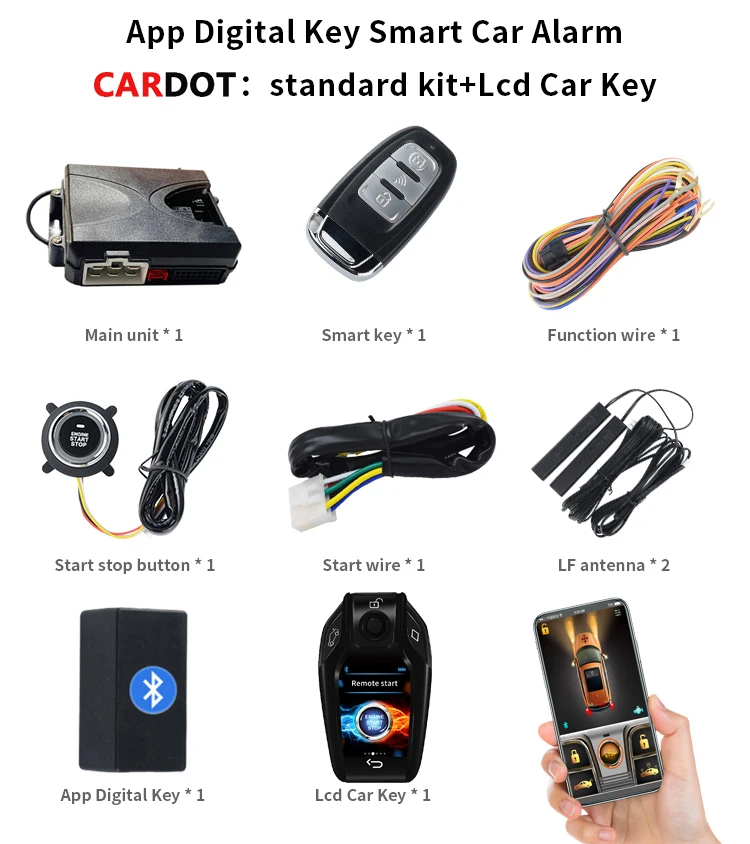 Основной блок-1 шт., стартовые кабели-1 шт., основные кабели-1 шт., автомобильный жидкий ключ-1 шт., умный ключ-1 шт., антенны-2 шт., кнопка запуска-1 шт., 1 шт. Bt модуль (подарок!),1 светодиодный светильник, 1 цветная коробка.