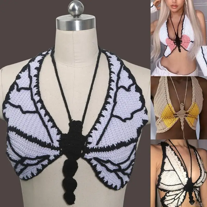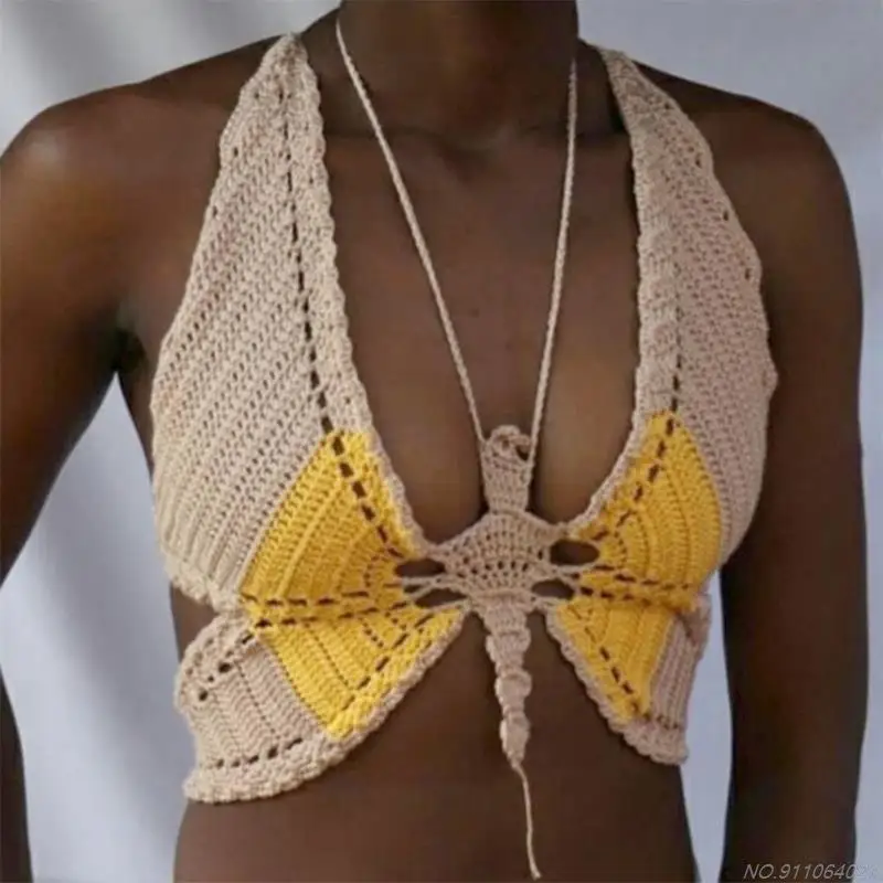 Женский летний сексуальный ажурный трикотажный топ с глубоким v-образным вырезом, укороченный топ на бретельках без спинки, вязаный крючком бюстгальтер с бабочкой, Пляжная майкаОписание: