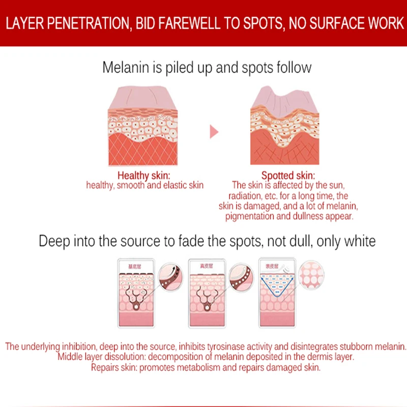 В основном для кожи желтого цвета, появляется кожа кожи, которая содержит передовые отбеливающие ингредиенты и составные растительные экстракты, может эффективно подавлять активность фермента, быстрое отбеливание кожи.