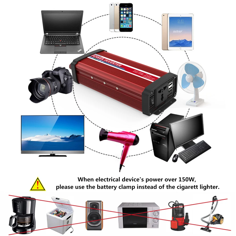 1) Убедитесь, что Номинальная мощность выше, чем устройство, которое вы хотите применить. 2) Если вы хотите одновременно запускать несколько устройств, вы должны обратиться к общей мощности. 3) Если вы хотите работать с индуктивной нагрузкой в течение длительного времени, выберите Инвертор чистой синусоидальной волны. 4) Пожалуйста, не подключайте инвертор к сети питания, и обратное соединение положительного и отрицательного также запрещено. 5) перед подключением убедитесь, что выключатель инвертора закрыт. И отсоедините аккумулятор и инвертор, когда инвертор не используется. 6) Пожалуйста, используйте стандартные кабели батареи, которые мы отправили, или полная выходная мощность не может быть гарантирована. 7) Пожалуйста, не перегружайте. Если ваши приложения индуктивные нагрузки, пожалуйста, выберите инверторы, непрерывная мощность которых в 3-7 раз выше, чем Ватты ваших приборов. Такие как холодильник, ледяной ящик, дрель, стиральная машина, водяной насос, микроволновая печь, духовка, пылесос, фен и т. д. с двигателем внутри. Пожалуйста, убедитесь, что постоянная мощность нашего инвертора отвечает вашим потребностям перед заказом, или проконсультируйтесь с нами для получения более подробной информации.
