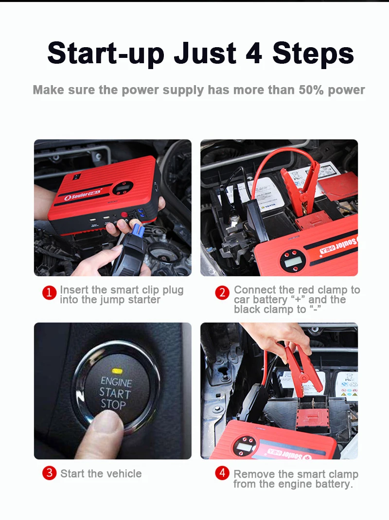Интеллектуальные перемычки оснащены более чем 8 передовыми технологиями безопасности против коротких замыканий, перегрева, переразряда, перенапряжения, перегрузки, глубоких разрядов, перегрузки по току и обратной полярности, делает его полностью безопасным для использования. Капающие шумы и предупреждающие сигналы мигают при запросе для устранения проблем, безопасно и надежно.