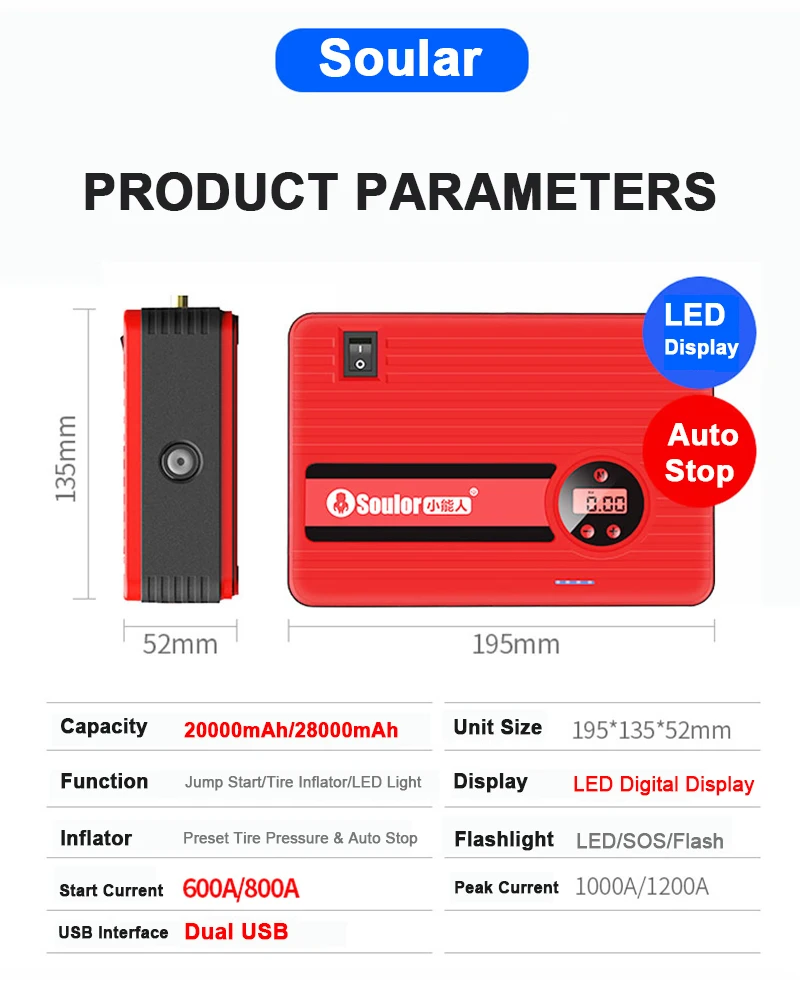 Этот автомобильный стартер с 24000mAh 1200A и воздушным насосом для автомобиля 150psi, подходит для автомобилей, грузовиков, мотоциклов, снегоходов, внедорожников, квадроциклов, UTV, газонокосилок, лодки и яхты и т. Д. (до 8 л бензина или 6. 5л дизельный двигатель). Кроме того, этот прыжок стартер добавил функцию воздушного насоса. Максимальное значение давления воздуха составляет 150 фунтов на квадратный дюйм. Автоматический пусковой аппарат + автоматический надуватель 2в1. Попрощайтесь с проблемами автомобилей, которым пришлось носить различные аксессуары в прошлом. Теперь он может решить все проблемы, которые могут возникнуть, когда появится автомобиль. Этот встроенный воздушный шланг для подкачивания шин для стартера аккумулятора позволяет накачать 20 дюймовую шину всего за 5 минут. И пусковое устройство воздушного компрессора поставляется с тремя воздушными иглы для накачивания, для надувания воздушной кровати, Каяка, различных мячей, надувного бассейна и других насосных продуктов.