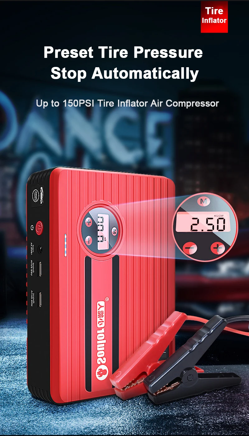 ЖК-экран для чтения, может просматривать состояние питания стартера, может просматривать состояние вашей шины. Аварийный светильник более мощный, чтобы использоваться в любом месте в любое время. Автомобиль jump starteris оснащен светодиодный светильник, чтобы избежать дорожных аварий из-за проблем с давлением в шинах. Цифровой светодиодный дисплей позволяет четко и точно установить значение давления в шинах, он автоматически отключится при достижении заданного давления. И этот внешний аккумулятор способен полностью заряжать ваш телефон, камеру или другое устройство.