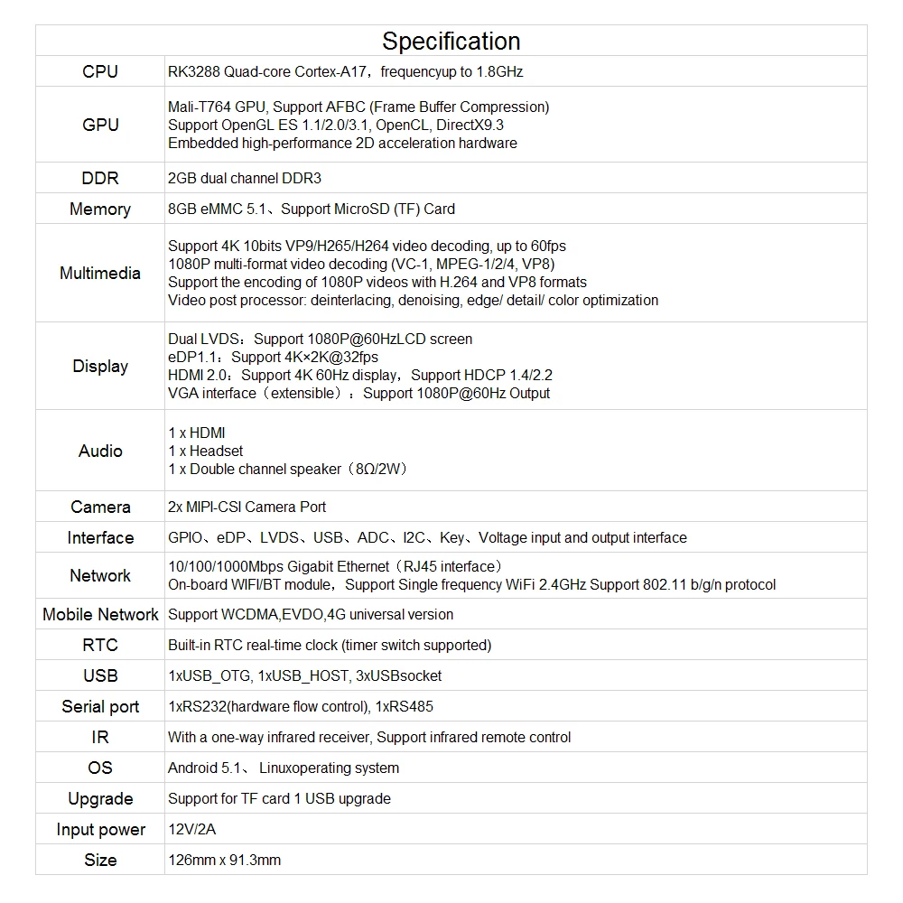 Использует четырехъядерный Cortex-A17processor RK3288, поддерживает аппаратное декодирование 4K, имеет богатый интерфейс расширения, а также совместим с основными дисплеями. Он принимает процесс погружения золота и прошел различные испытания давления, которые могут быть применены непосредственно к продукту.