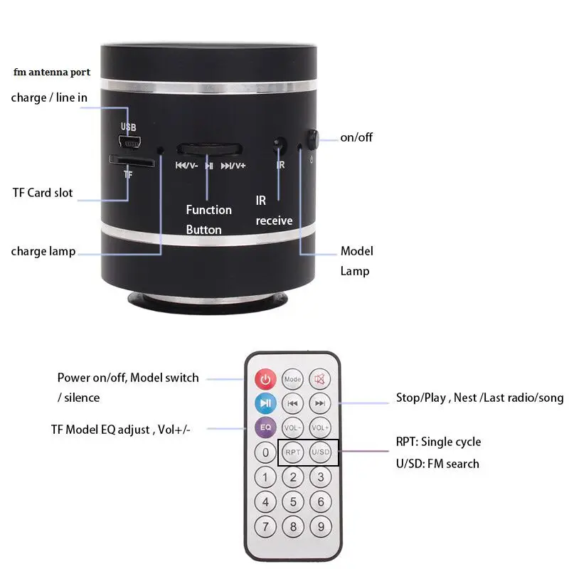 Нажмите кнопку «Вкл/Выкл», чтобы открыть динамик! Затем включите и Выключите динамик с помощью пульта дистанционного управления и Используйте пульт дистанционного управления для переключения других функций