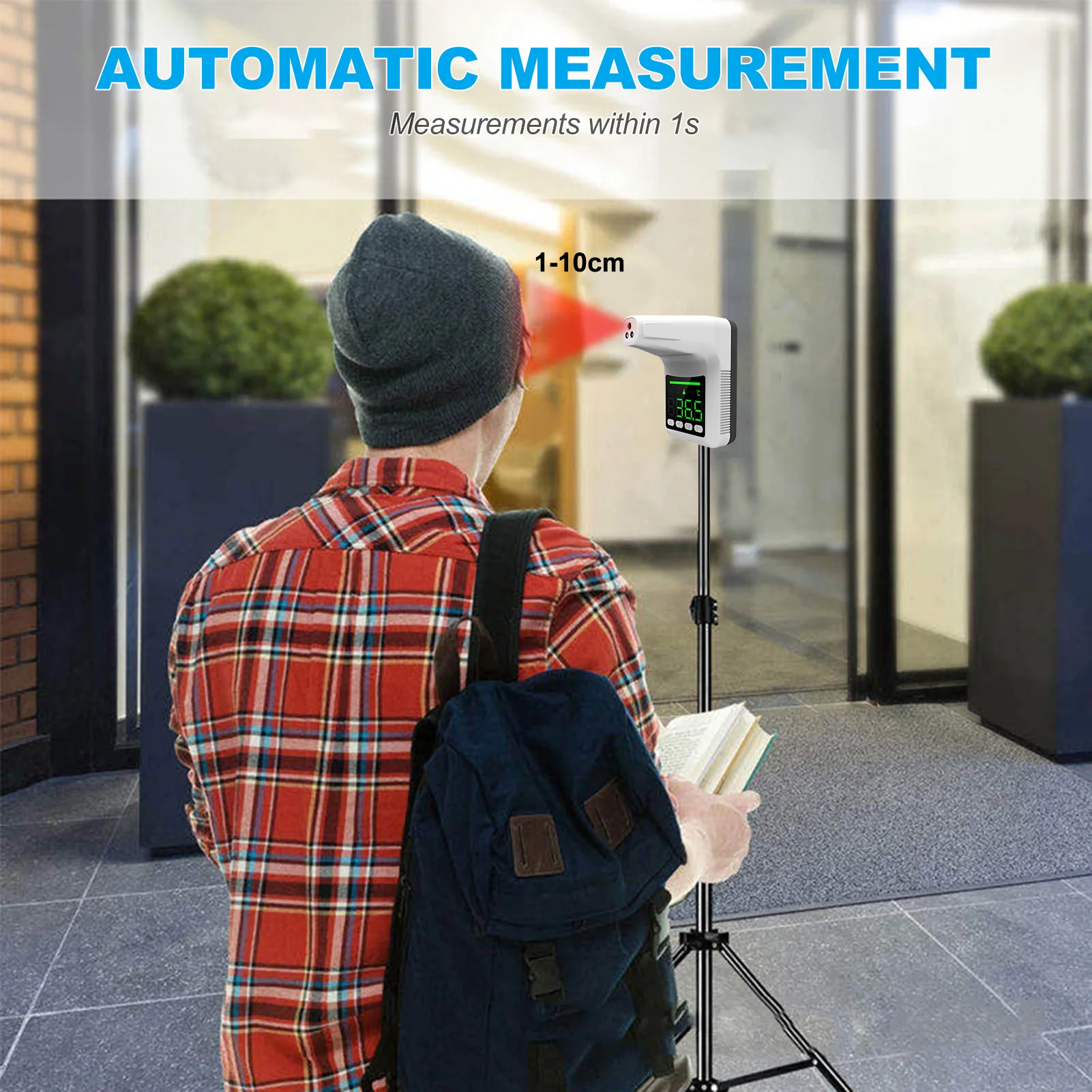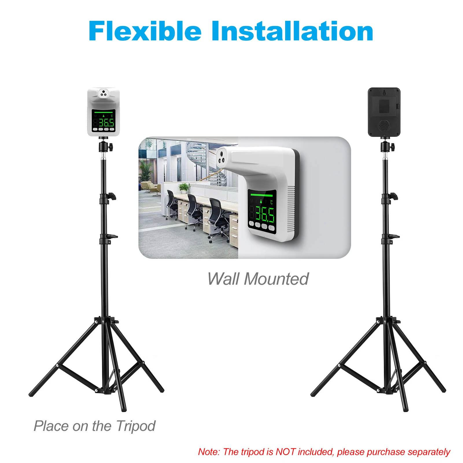 The wall-mounted non-contact infrared thermometer can measure temperature within 1-10cm distance from forehead within 1S, reliable and accurate readings display on the screen. Celsius and Fahrenheit unit can be switched. It also features muti-language voice broadcast and 3-color indicator light alarm function. It can be wall mounted or tripod supported, and can be widely used in home, offices, hotels, shopping malls, supermarkets, schools, restaurants, rail stations, factories and more public places.