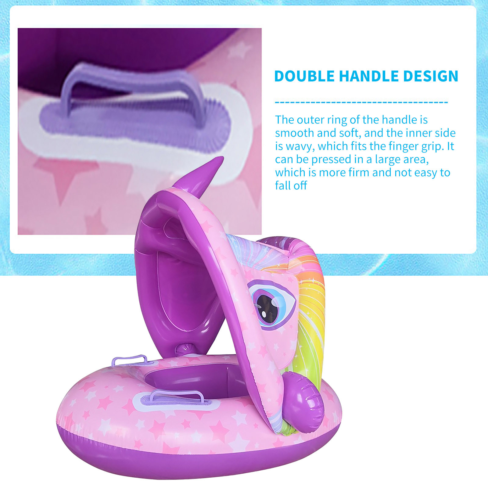 Регулируемый и Съемный навес от солнцаДетский плавательный поплавок имеет регулируемый и съемный дизайн. Навес от солнца можно отрегулировать на полное покрытие или половину покрытия, чтобы предотвратить загорание нежной кожи ребенка. Вы можете снять навес во время игры в пасмурный день или в вечернее время.