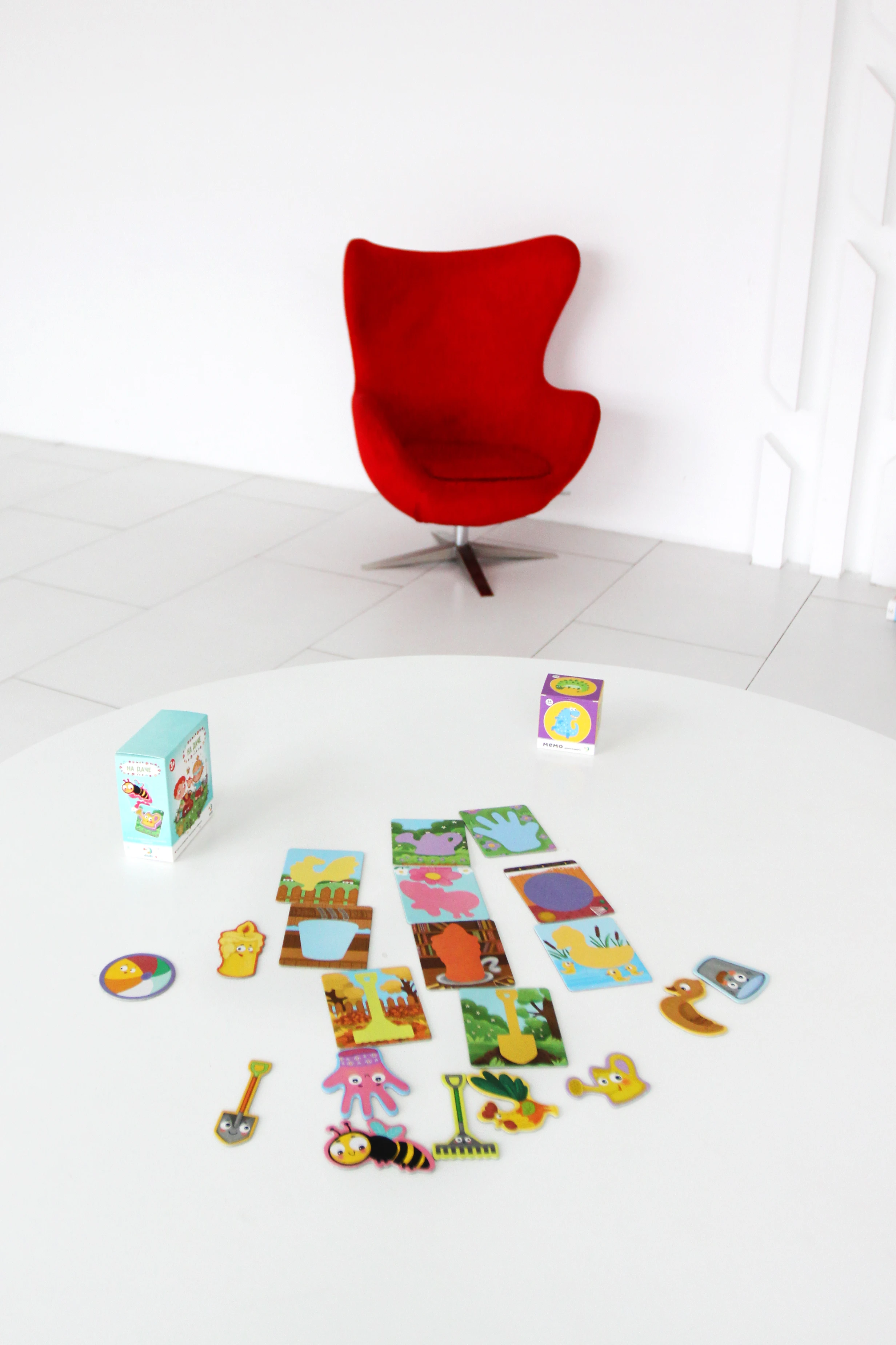 Ее набор содержит 10 прямоугольных карточек-планшеток, на которых нарисованы контуры предметов. Именно их чаще всего можно встретить на даче.