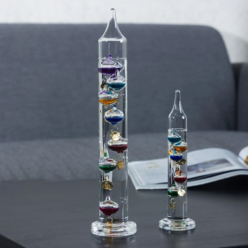 Термометр Galileo с тегами температуры, прикрепленными к стеклянным шарикам, которые поднимаются и падают, чтобы указать температуру в помещении.