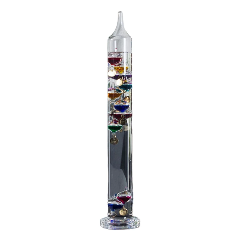 1. Термометр Galileo с тегами температуры, прикрепленными к стеклянным шарикам, которые поднимаются и падают, чтобы указать температуру в помещении.