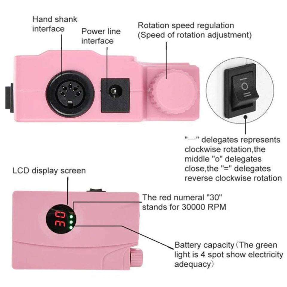 Профессиональная электрическая дрель для ногтей с встроенной батареей емкостью 2200 мАч, которая отлично подходит для всех типов работы ногтей от скульптуры, полировки до полировки. Идеально подходит, когда вы доставляете его в путешествие!