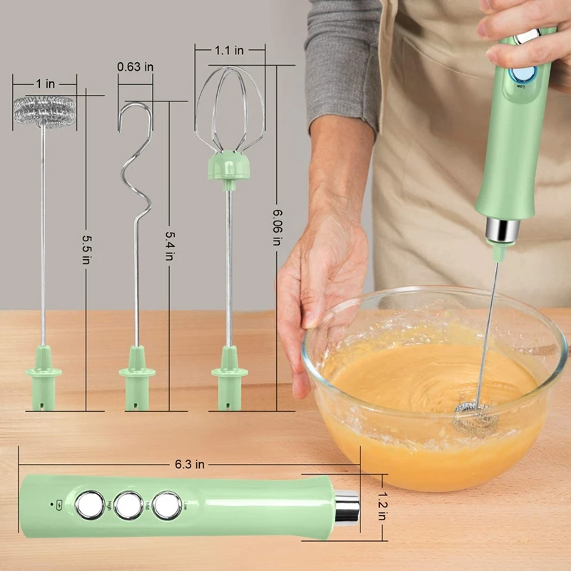3 в 1 электрические венчики: съемные и сменные венчики изготовлены из пищевой нержавеющей стали. Насадка для венчика отлично подходит для кофе, латте, капучино, горячего шоколада, баклажан и т. д. Насадки для взбивания крючка и баллона отлично подходят для смешивания яиц, кремов, сыров, сухого молока и т. д.