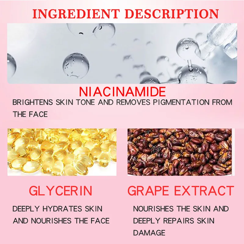 Восстанавливает питание осветляет кожу увлажняющий красный спирт сталкивается с никотинамидом, который питает и восстанавливает чистую воду, бережно ухаживает за кожей, восстанавливает поврежденную кожу во время сна, углубляет поры, восстанавливает влагу и питание, фиксирует влагу и увлажняет, улучшает сухость кожи, шероховатость, тонкие линии и т. д. Делает кожу мягкой и блестящей. Использование: После очищения кожи в ночное время нанесите правильное количество этого продукта равномерно на лицо, немного массируйте, а затем ложитесь спать после впитывания маски, не нужно мыть, затем промойте его водой утром.