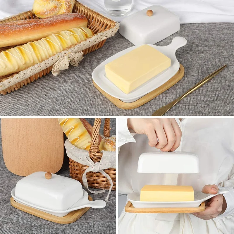 Уникальный дизайн-блюдо для масла с бамбуковым лотком, ручкой, коньком внутри-элегантный радиус изогнутых краев. Имеет небольшую ручку сверху, чтобы приподнять крышку, что позволяет аккуратно поместить ваше твердое масло внутрь и легко покрыть его, На блюде также есть небольшой гребень, так что масло остается в середине блюда, и есть меньше шансов уронить крышку на край масла.