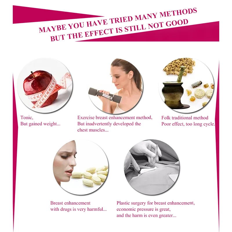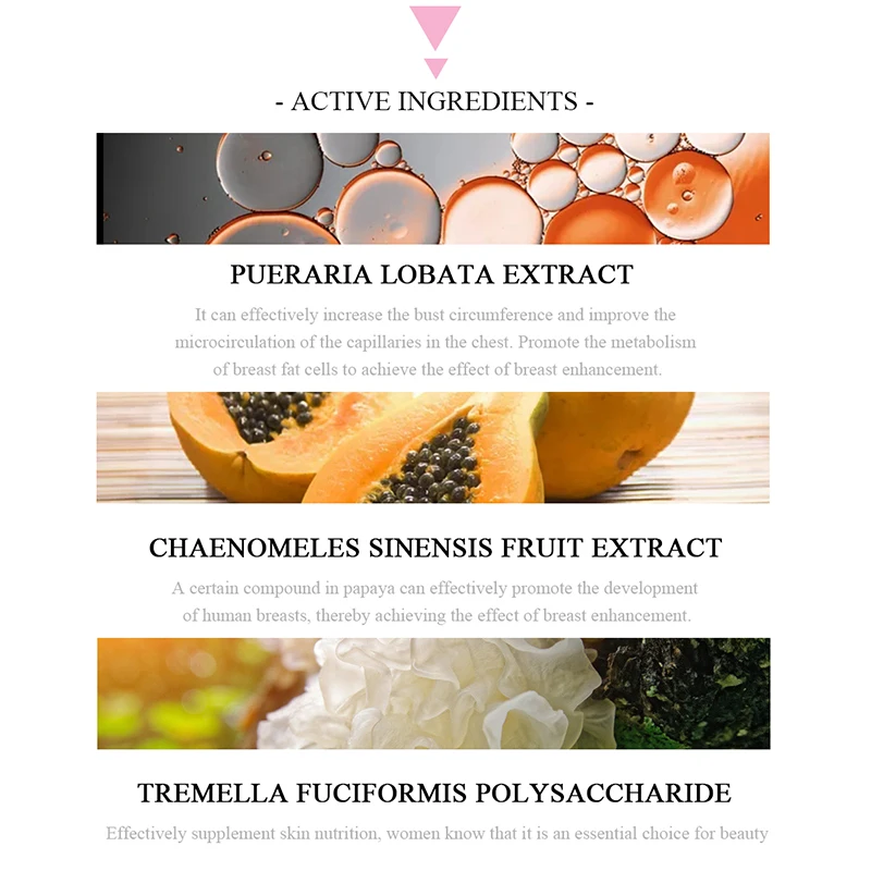 Он может эффективно увеличить окружность бюста и улучшить микроциркуляцию капилляров в груди. Способствует метаболизму жировых клеток груди для достижения эффекта увеличения груди.