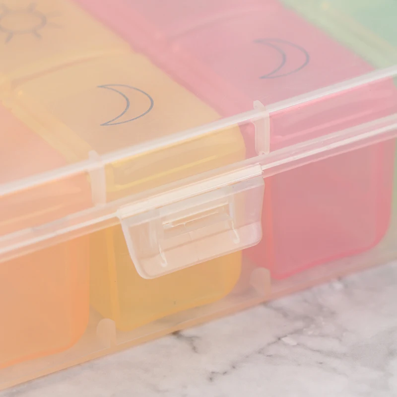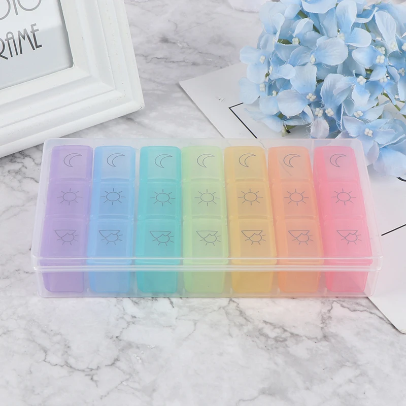 Индивидуально разделенный чехол для таблеток, в этом футляре 7 съемных коробок и в каждой коробке 3 отдельных кубических отсека, гладкая поверхность не адсорбирует остатки, что позволяет избежать смешивания остатков прежних таблеток в текущие таблетки и легко чистить.
