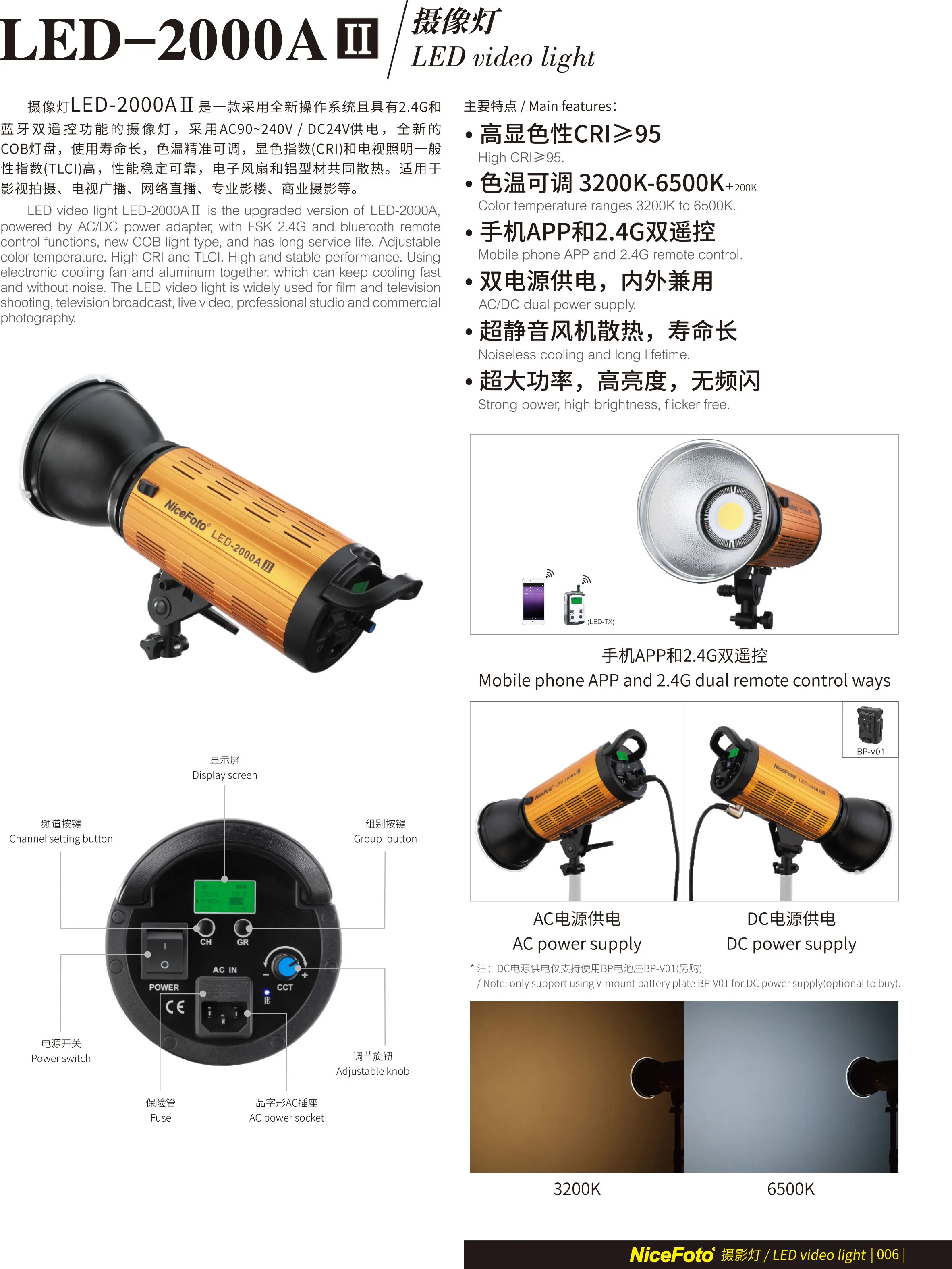 ЖК-дисплей:С ЖК-экраном может отображать сигнал пульта дистанционного управления, каналов, группировки, яркости, цветовой температуры и уровней заряда батареи, прост в эксплуатации.