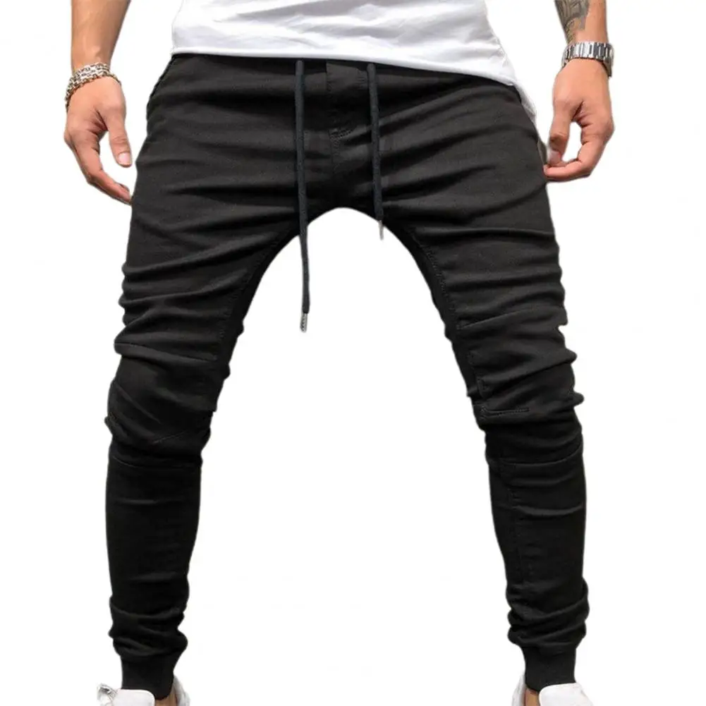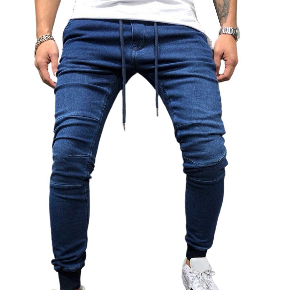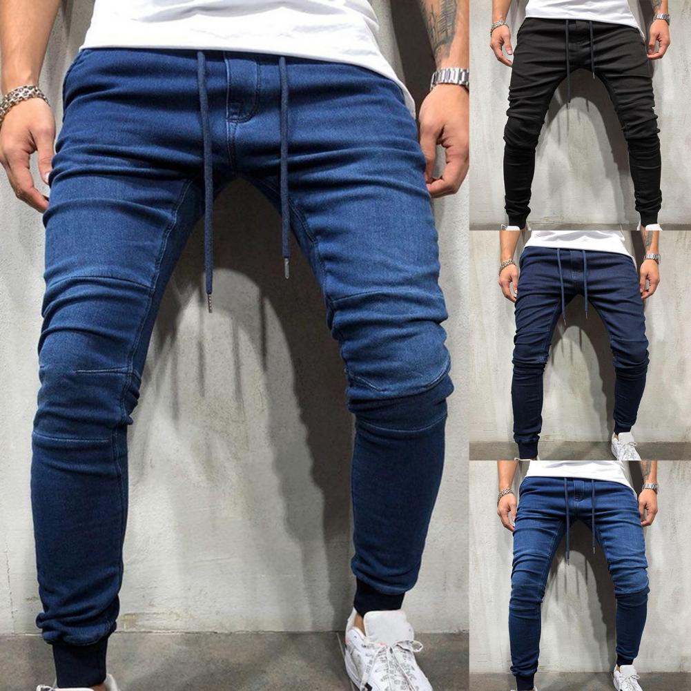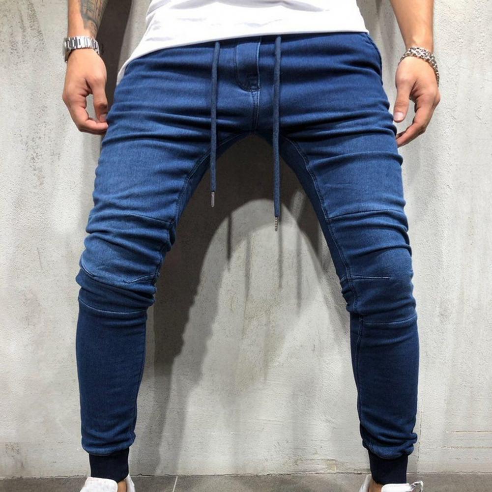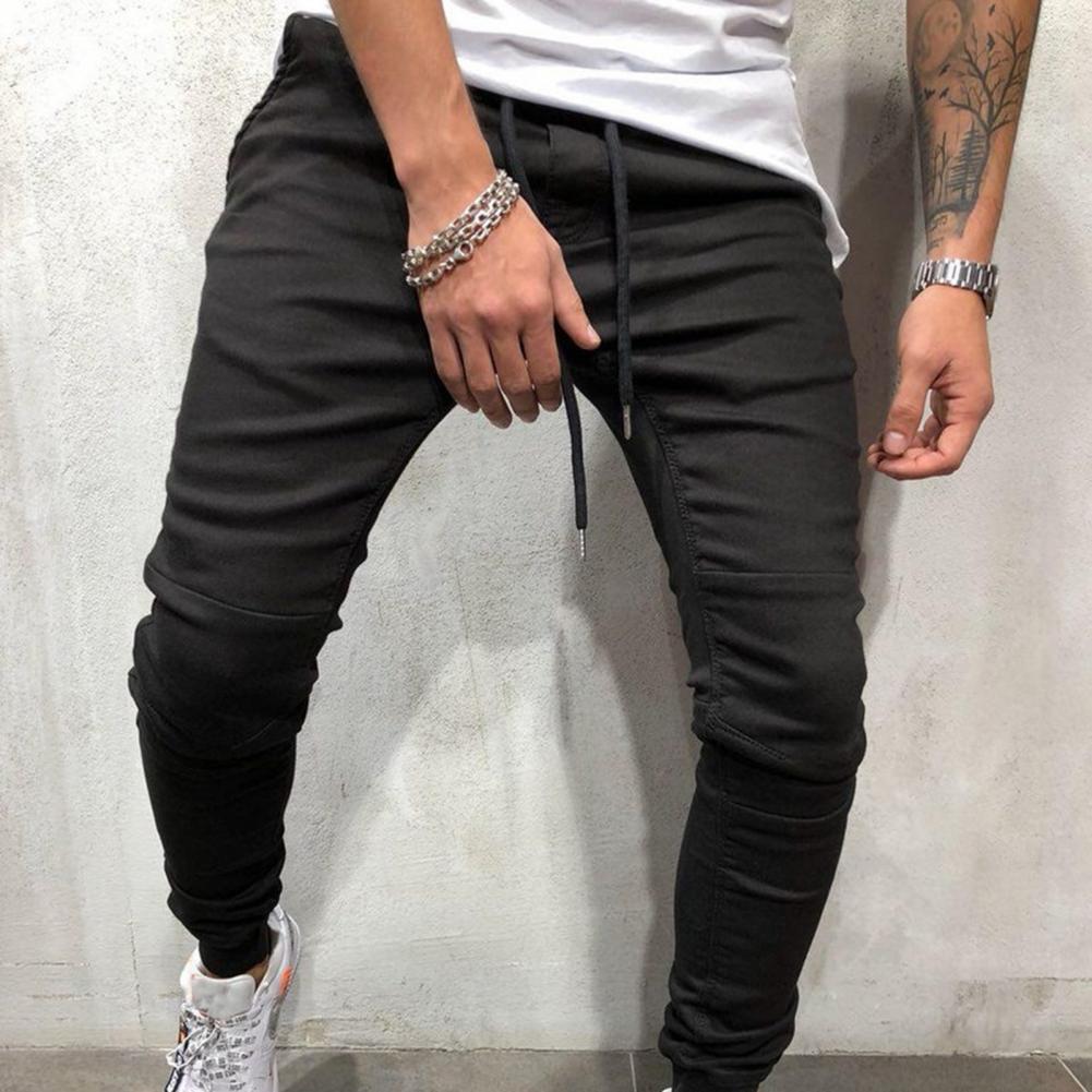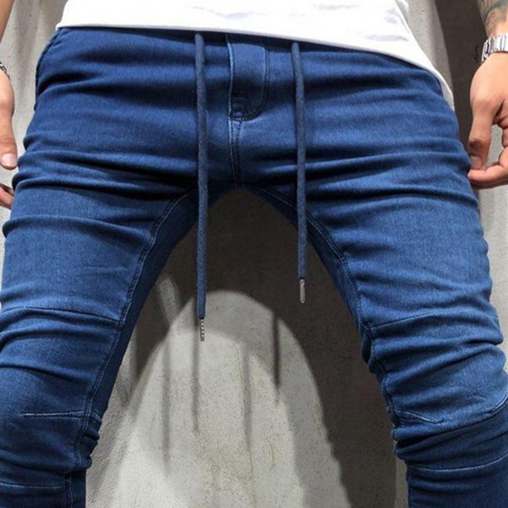 Однотонные мужские джинсы со шнурком, джинсовые джинсы со средней талией, джинсовые брюки-карандаш