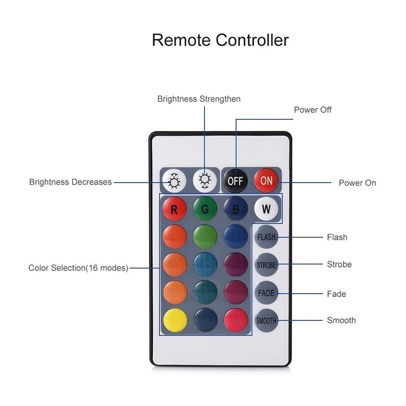 Многоцветный изменяющий светильник: 16 различных цветов (красный, зеленый, синий, желтый, светло-зеленый, бирюзовый, фиолетовый, розовый и еще 3 варианта в пределах и белом цвете).