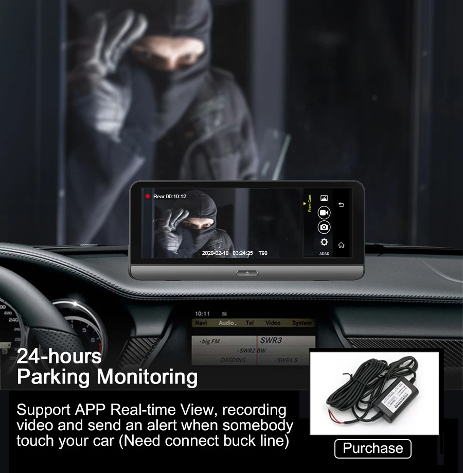 When someone near your car or vehicle starts to move, Automatically turn on and start recording when detects any impact or collision,the device automatically automatically recording for few seconds,make sure 24hr Parking Guard.Attention:It should be connected by a buck line