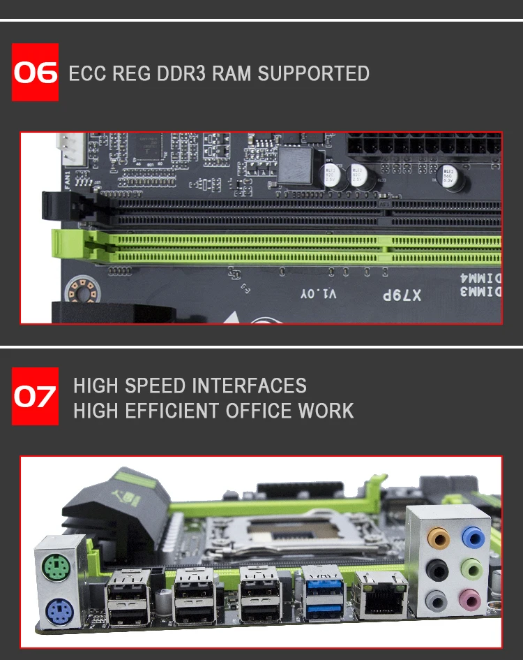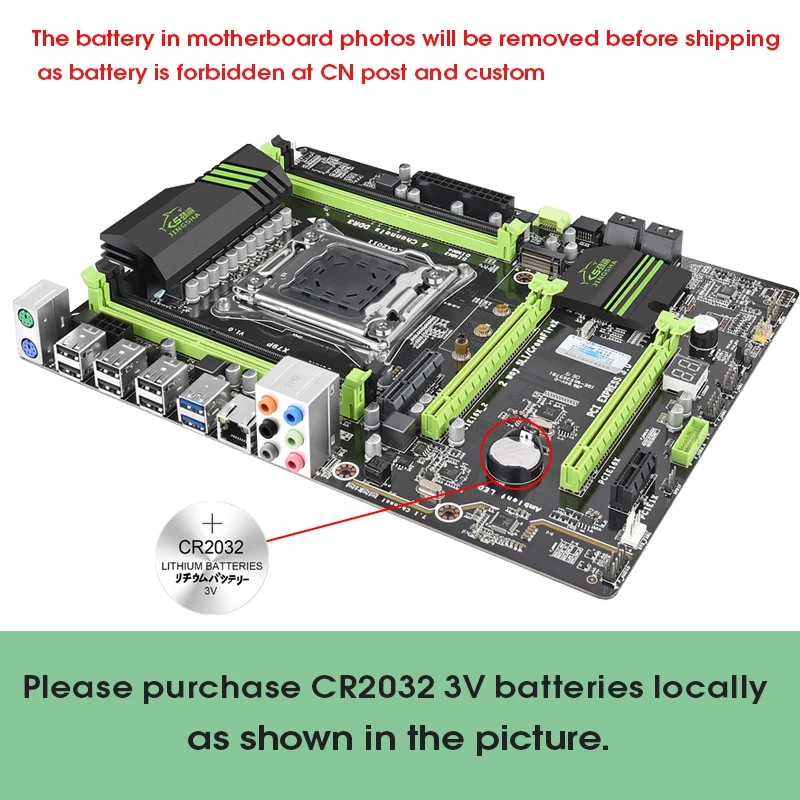 1:The memory slot may vary from batch to batch, but it will not affect the use of the product.The product is constantly optimized and upgraded. 2:Please allow 1-3mm differs due to manual measurement. 3:Due to the different display and different light, the picture may not show the actual color of the item.Thanks for your understanding. 4:This planform needs powerful power supply.please make sure your power supply can enough to supports this planform.(at least 500w brand power supply) 5:The battery in motherboard photos will be removed before shipping, as battery is forbidden at CN post and custom. For tax problem ,pls make sure you can solve the customs clearance problems by yourself, if you can't solve it, we don't advise you to buy goods in our store.We are not responsible for customs duties.Thanks for your kindly understanding.