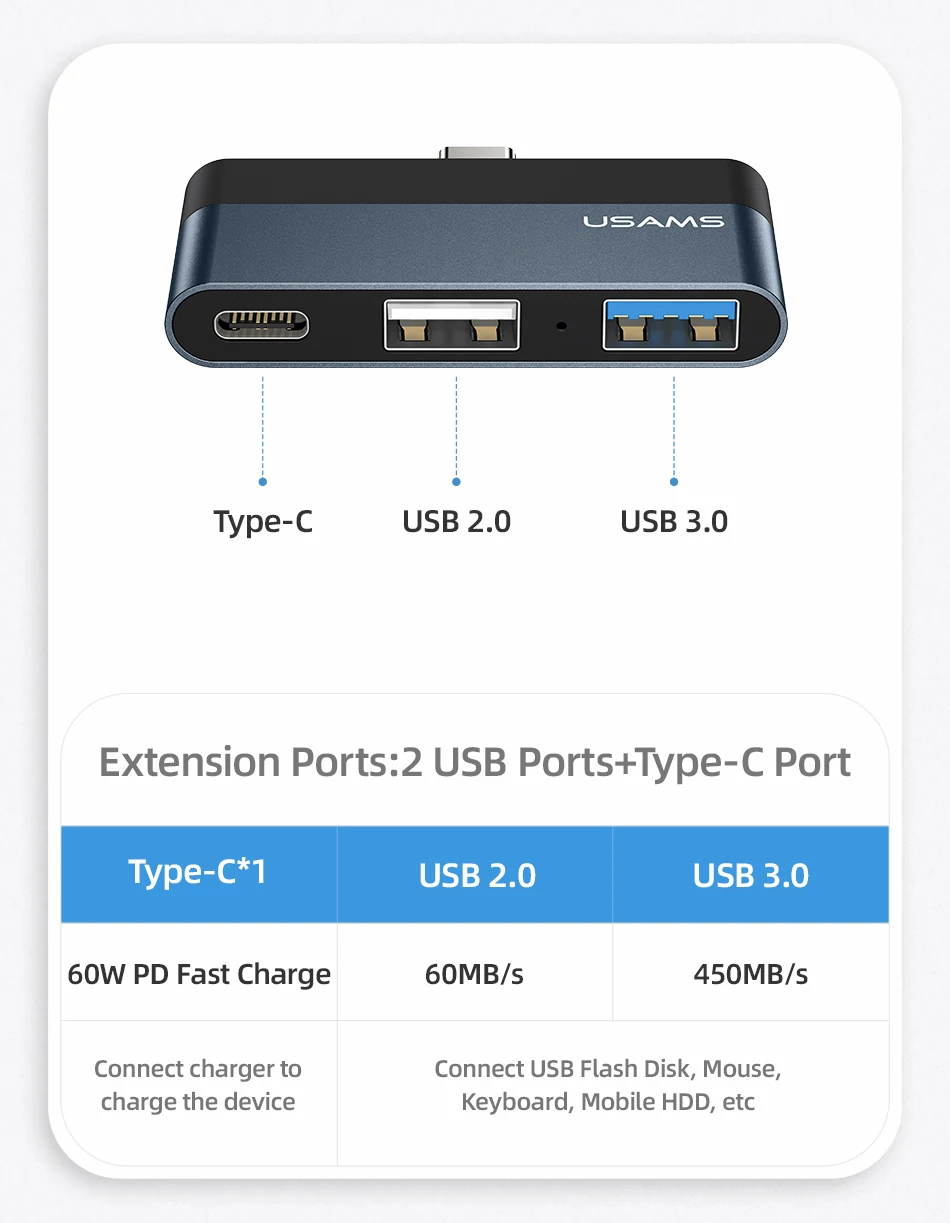 Удлинительный порт s: 2 порта USB s + порт Type-C
