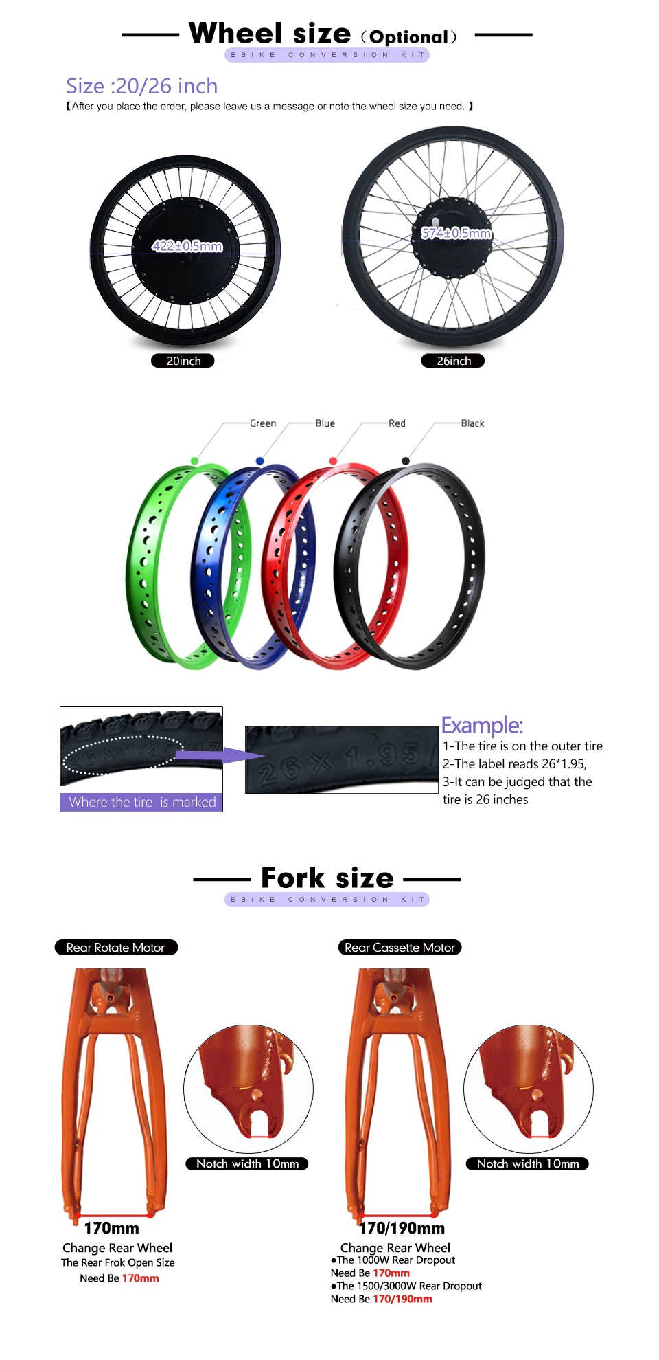 Колеса имеют 4 цвета (красный, зеленый, синий, черный), наш комплект для переоборудования электрического велосипеда по умолчанию черный, если вы хотите другие цвета, пожалуйста, свяжитесь с нами или замечания
