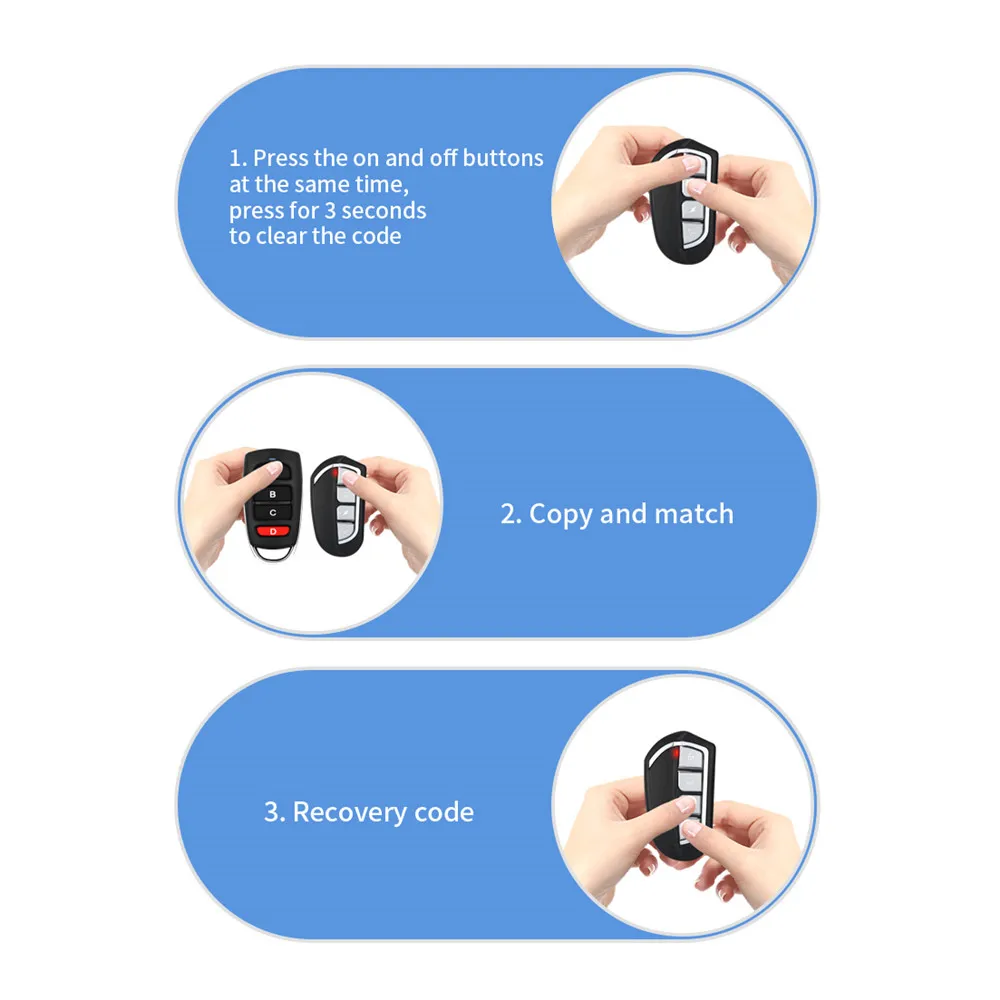 2. Копия: левая рука принимает оригинальный пульт дистанционного управления, правая рука принимает наш клонированный пульт дистанционного управления и держать два дистанционного управления как можно ближе; Нажмите первые клавиши двух пультов дистанционного управления одновременно; примерно за 2 секунды светодиодный светильник будет мигать быстро 2 раза; Через одну секунду Светильник индикатора мигает и отпускает пальцы; А затем нажмите кнопку после успешного изучения, светильник продолжает гореть, это означает, что первый код ключа на оригинальном пульте дистанционного управления был скопирован на другой пульт дистанционного управления; Тот же метод может быть использован при включении второго ключа, Третий ключ... Если копия выполнена успешно, функция дистанционного управления является такой же, как и исходный соответствующий пульт дистанционного управления.