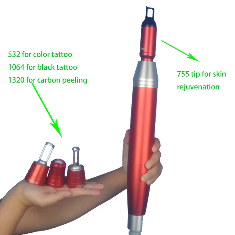 Ручка Picoseond поставляется с 4 лазерными наконечниками, включая фиксированный размер пятна 1064nm и 532nm, 1320nm.755nm