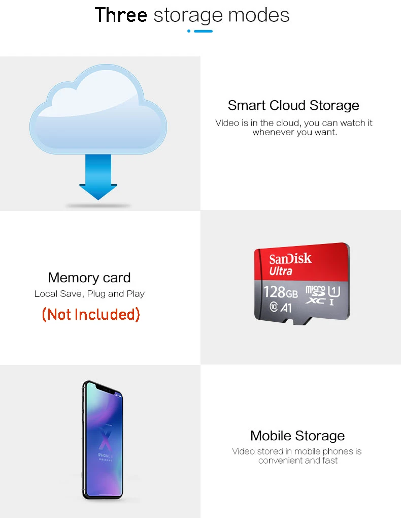 Три режима хранения (интеллектуальное Облачное хранилище/карта памяти/Мобильное хранилище)