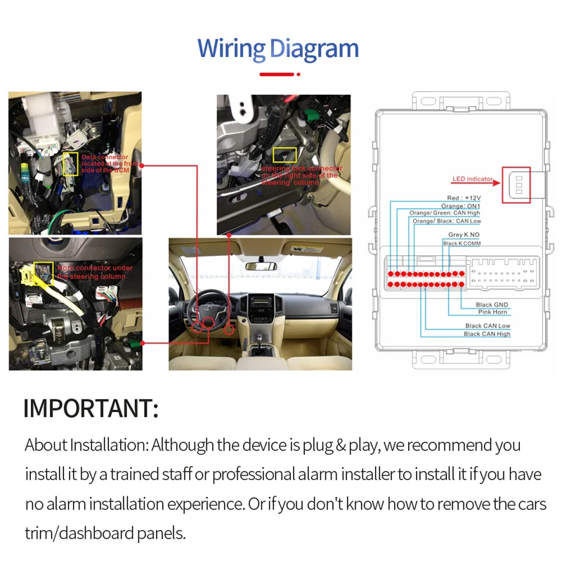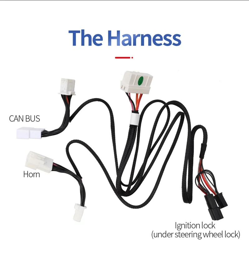 Дистанционный запуск двигателяПульт дистанционного управления не входит в комплект, он работает с оригинальным пультом дистанционного управления для удаленного запуска/остановки транспортного средства после установки.Продолжайте нажимать оригинальную кнопку блокировки пульта дистанционного управления 3 раза, удаляя запуск/остановку автомобиля.Важно: