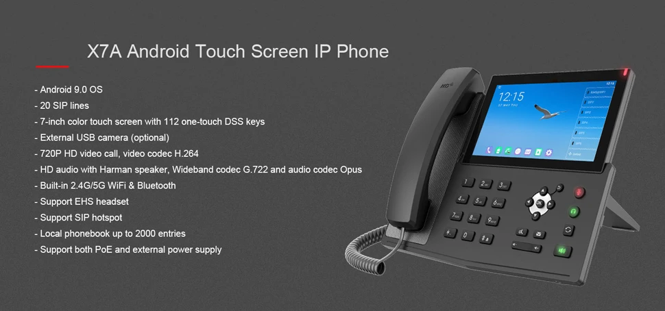 Как высококлассный ip-телефон с ОС Android 9,0, X7A обеспечивает более умную и плавную работу с сенсорным экраном для пользователей. 112 DSS клавиши на 7-ми дюймовый цветной сенсорный экран, встроенный Wi-Fi, встроенный модуль Bluetooth сделать ежедневному общению умнее и проще. Совместимая С опциональной usb-камерой CM60, X7A может предоставить превосходное аудио и видео для групповой Конференции.