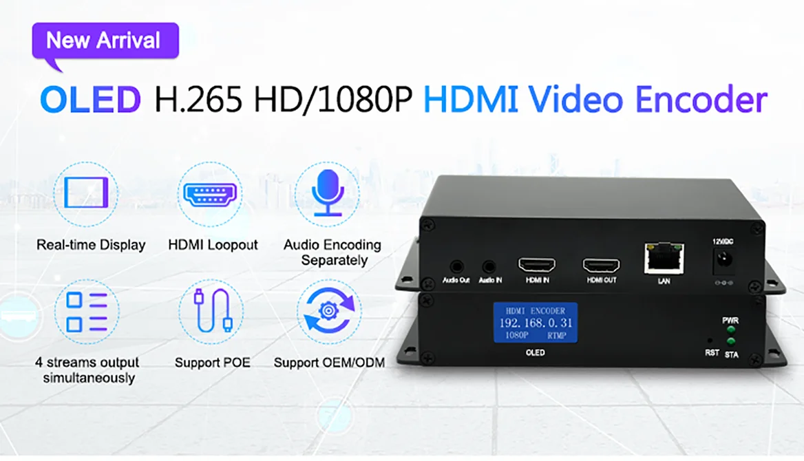 OTV-EL1 H.264 H.265 потоковый кодировщик IPTV является нашим профессиональным HD аудио и видео кодирующим устройством с мощным функционалом. Он оснащен 1 ch HDMI и аудио входом и выходом 1ch HDMI, поддерживающим формат кодирования H.265 и H.264 и двумя потоковыми выходами видео, которые передаются через SRT, HTTP, RTSP, UDP /RTP, RTMP, RTMPS, ONVIF, HLS, FLV. Максимальное разрешение HDMI составляет 1080p @ 60 кадров в секунду, а разрешение выходного потока может достигать 1080p @ 60 кадров в секунду для основного направления, 720 @ 60 кадров в секунду для основного и второго потока и т. Д.,