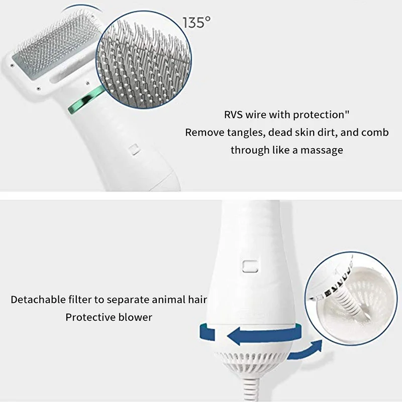 Безопасность: Этот продукт имеет RVS защитную нить, которая может удалять запутывания, омертвевшую кожу и грязь, а Уход как массаж. Он имеет съемный фильтр, который помогает отделить волосы животных и защитить фен.