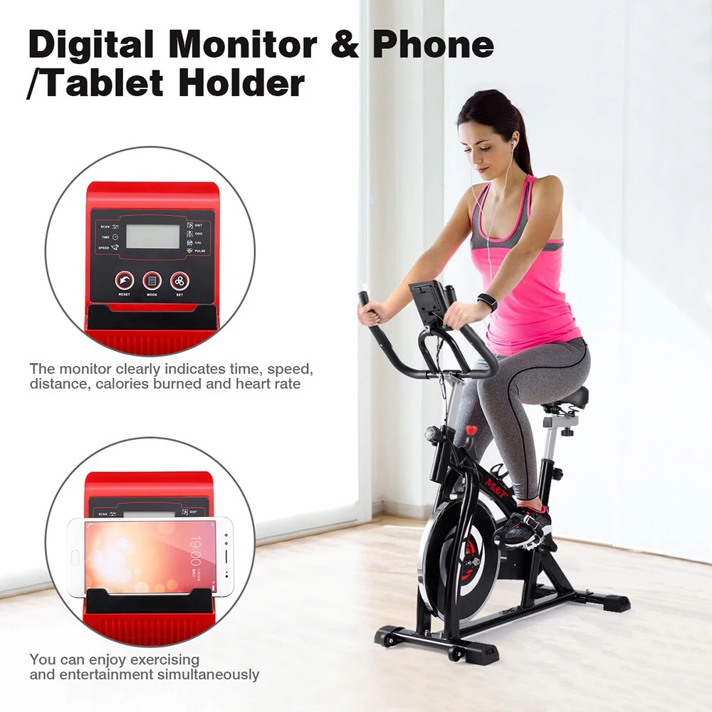 Этот велосипед стационарный отличается регулируемым сопротивлением и бесшумной ременной системой для обеспечения плавной и тихой езды. В нем есть держатель для планшета, чтобы вы могли наслаждаться развлечений во время езды на велосипеде. Цифровой ЖК-дисплей позволяет отслеживать спортивные мероприятия. Регулируемое сиденье и высота руля помогут вам найти лучшее положение для вас. Тренировочный велосипед оснащен противоскользящими клетчатыми педалями, держателем для бутылки с водой, транспортными колесами, удобными рулями и многими другими характеристиками, которые обеспечивают вам большое удобство во время тренировок.