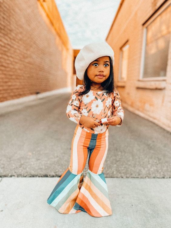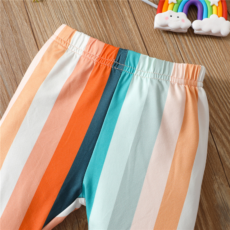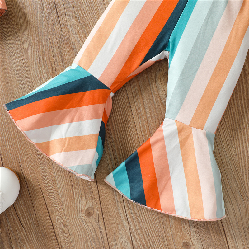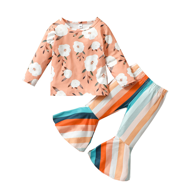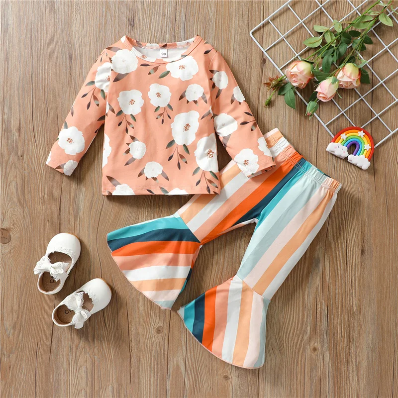 Осенняя одежда для малышей из 2 предметов футболка с длинными рукавами и цветочным рисунком + штаны в радужную полоску с колокольчиками для маленьких девочекСтильный комплект одежды для вашей милой дочери в качестве потрясающего подарка на день рождения!