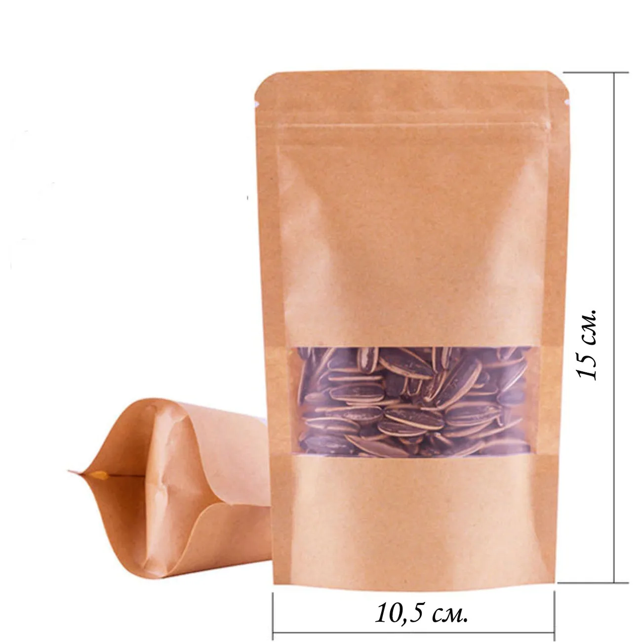 Крафт пакет с дном, замком Зип-лок и демонстрационным прозрачным окном. Имеются в продаже пакеты с разной высотой окна (высота окна указана в скобочках) Имеет матовую внешнюю поверхность, на внутреннюю нанесена ламинация, делая пакет влаго- и жиростойким. Отлично подойдет для упаковки выпечки, конфет, а также чая, кофе, сухофруктов и орехов.