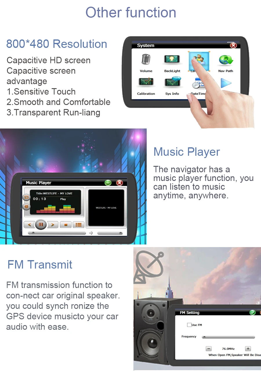 -9 дюймов 800*480 HD емкостный сенсорный экран-Флэш-память (ПЗУ)-8 Гб-ОЗУ 256 Мб-Внешняя-sd-карта, поддержка (2 ГБ, 4 ГБ, 8 ГБ, 16 ГБ, 32 ГБ), максимальная память 32 ГБ-ЦП: MTK MS2531 800 МГц-Fm-передатчик с полной частотой: выход аудио из этого навигатора в стереосистему Вашего автомобиля-Порт наушников для аудиовыхода-Аудио плеер/видеоплеер/фото браузер/калькулятор/блок конвертер/Календарь/игры/музыка/кино-Подключение: USB 2,0, слот для tf-карты, разъем для наушников, AN-IN-Язык: английский/русский/французский/испанский/немецкий/Португальский/Венгерский/романа/Польский/Словенский/румынский/турецкий, чешский, греческий (можно добавить на различных языках)