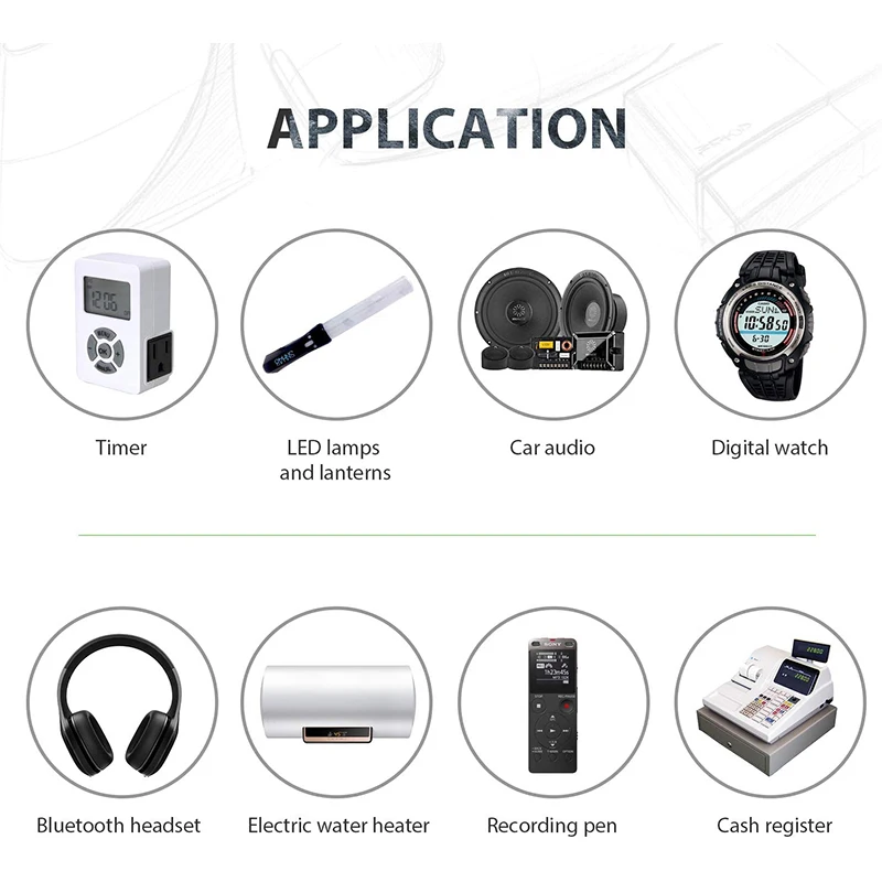 Применение: компьютеры, камеры, цифровые камеры, КПК, пульты дистанционного управления, видеокамеры, электронные игры, часы, калькуляторы, электронные инструменты, автомобильная сигнализация безопасности, MP3-плееры, светодиодный индикатор, цифровые диктофоны, игрушки, глюкоза в крови, тестирование холестерина, счетчики