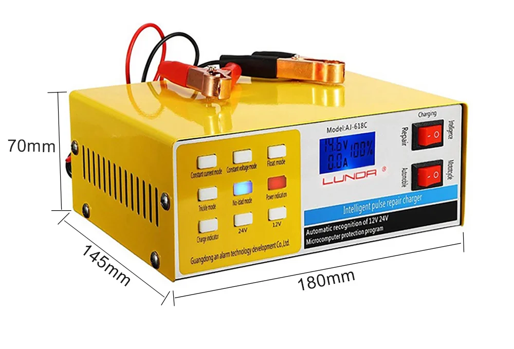 Эта модель 618C зарядное устройство специально разработано и изготовлено для 12 V/24 V свинцово-кислотных, сухих батарей, водяных батарей, свинцово-кислотных необслуживаемых батарей