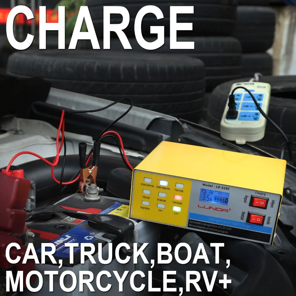 Идеально подходит для зарядки всех свинцово-кислотных, сухих аккумуляторов 12 в 24 В, водяных аккумуляторов, свинцово-кислотных необслуживаемых аккумуляторов и безопасного зарядного устройства