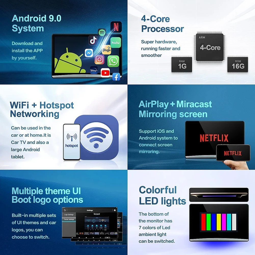 1. Мощный монитор подголовника: Android 9,0 подголовник автомобиля видео плеер, 4-ядерный, Процессор, ОЗУ 1 ГБ/16G rom, (например, таблетки) может быть легко подключен к WiFi или горячим точкам в автомобилях или мобильных телефонах. Таким образом, вы можете смотреть Youtube, новости, Netflix фильмы, играть в игры онлайн, загружать приложения или игры в Google play, проверять электронные письма, Facebook чаты и т. Д.